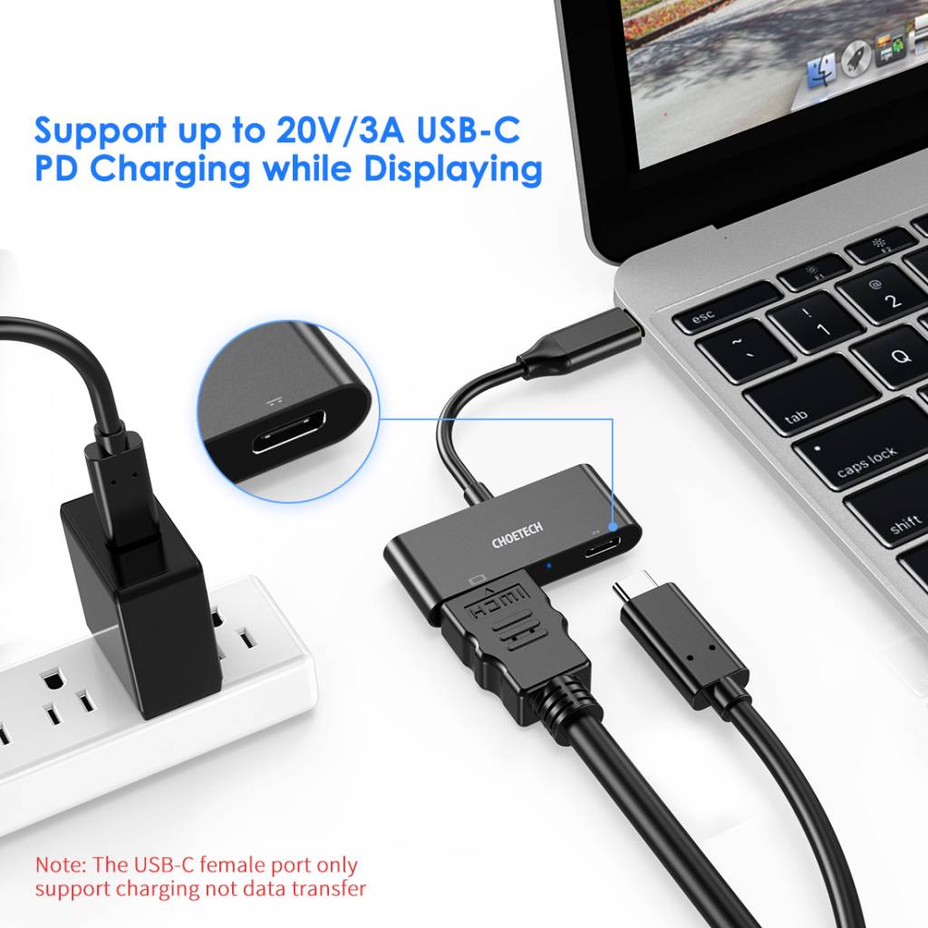 Der Choetech Adapter ist mit einem USB-C Port mit Power Delivery ausgestattet. Auf diese Weise können Sie Ihren Laptop mit bis zu 60 W aufladen, während Sie den HDMI-Anschluss verwenden.
