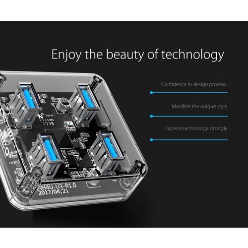 Sehr einzigartig für diese Nabe Orico ist, dass es transparent ist. Sie werden sehen, enthält alle Komponenten, einschließlich der VL817-Chip und der Leiterplatte. Es ist sehr cool die Nabe auf dem Schreibtisch zu platzieren. Das Produkt an der Unterseite hat Anti-Rutsch-Material, so dass es an der richtigen Stelle bleibt.