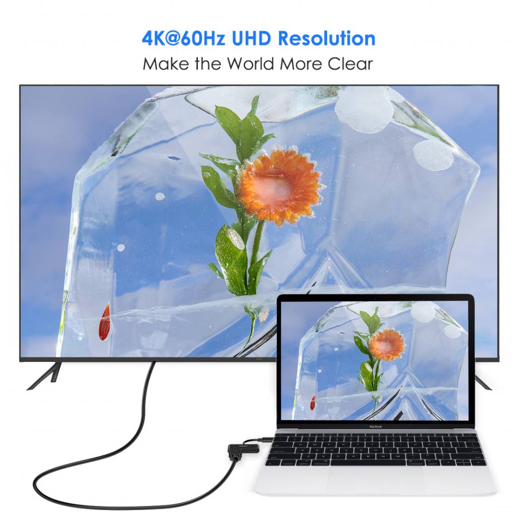 The Choetech Type-C to 4K HDMI adapter can connect a laptop or computer with USB-C connection to a separate monitor / HDTV / projector with HDMI input, which support a UHD resolution up to 4K @ 60Hz. To achieve the maximum UHD 4K resolution, it is important that both the HDMI 2.0 cable and the monitor support a resolution of 4K @ 60Hz. If your type-C computer supports 4K @ 60Hz but the connected monitor does not, there will be a maximum 4K @ 30Hz output.