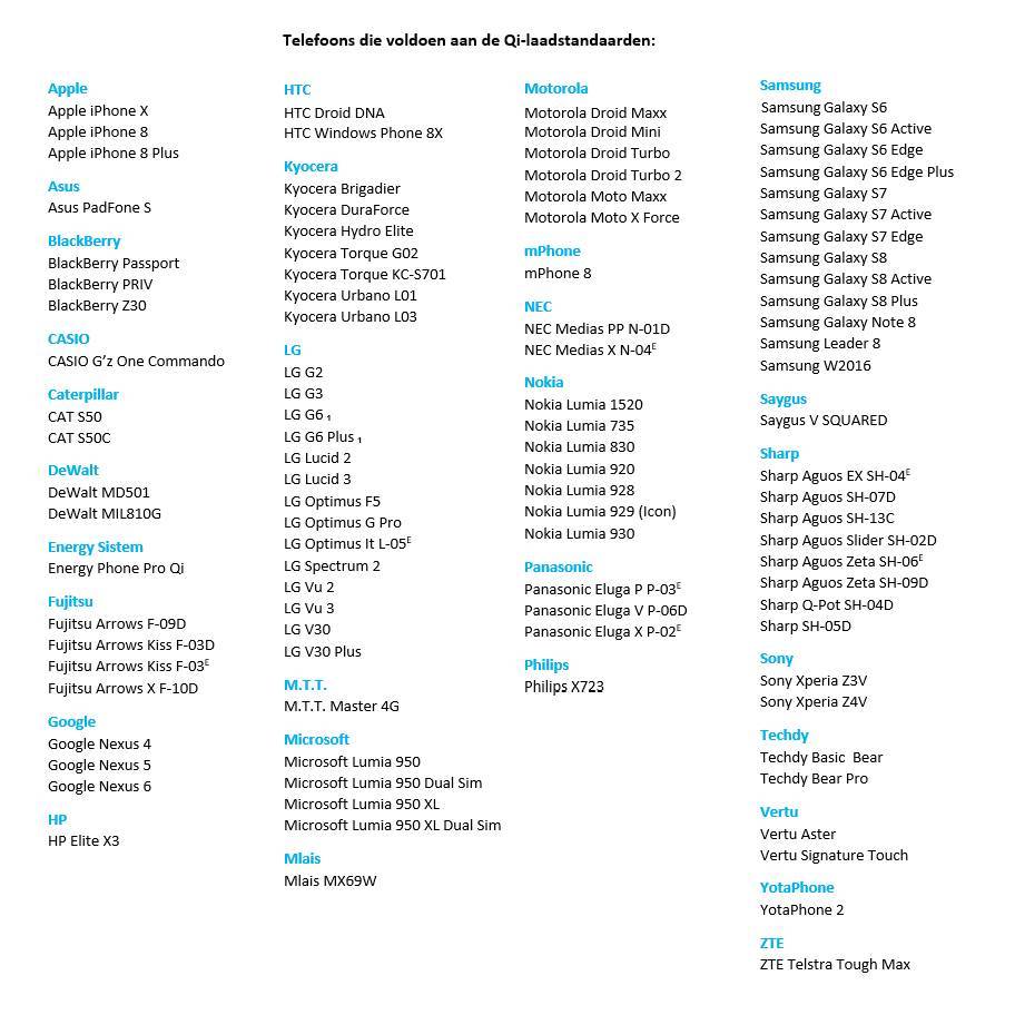 QI est le premier au monde à promouvoir des systèmes de normalisation pour la technologie de charge sans fil. En outre, cette Union a introduit la norme de charge sans fil qui présente deux caractéristiques importantes; commodité et polyvalence. Vous pouvez facilement placer votre smartphone sur le chargeur, après quoi il commencera immédiatement à charger. Aucun rayonnement n'est libéré par l'aimant au milieu du chargeur. Votre smartphone doit prendre en charge les normes Qi. Entre les images, vous trouverez un aperçu des téléphones qui ont ces normes de charge.