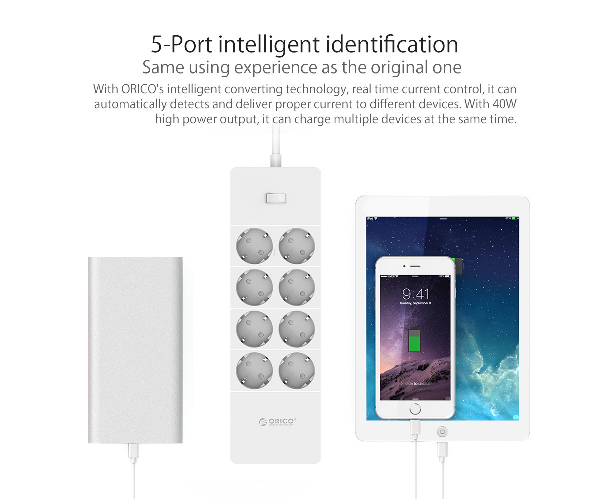 Laadt gemakkelijk meerdere apparaten tegelijkertijd op met de stekkerdoos van Orico, dat beschikt over maar liefst acht stopcontacten en vijf USB-laadpoorten. Apparaten die tegelijkertijd opgeladen kunnen worden, zijn onder andere een smartphone, tablet, draagbare spelcomputer, digitale camera of mp3-speler. Dit zijn 5V apparaten die met de vijf USB-laadpoorten opgeladen kunnen worden. Laadt door middel van de stopcontacten je laptop op of laat bijvoorbeeld een gezellige lamp branden.